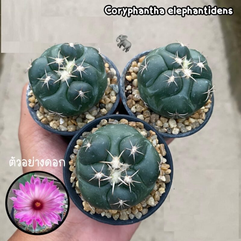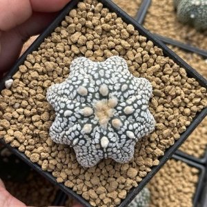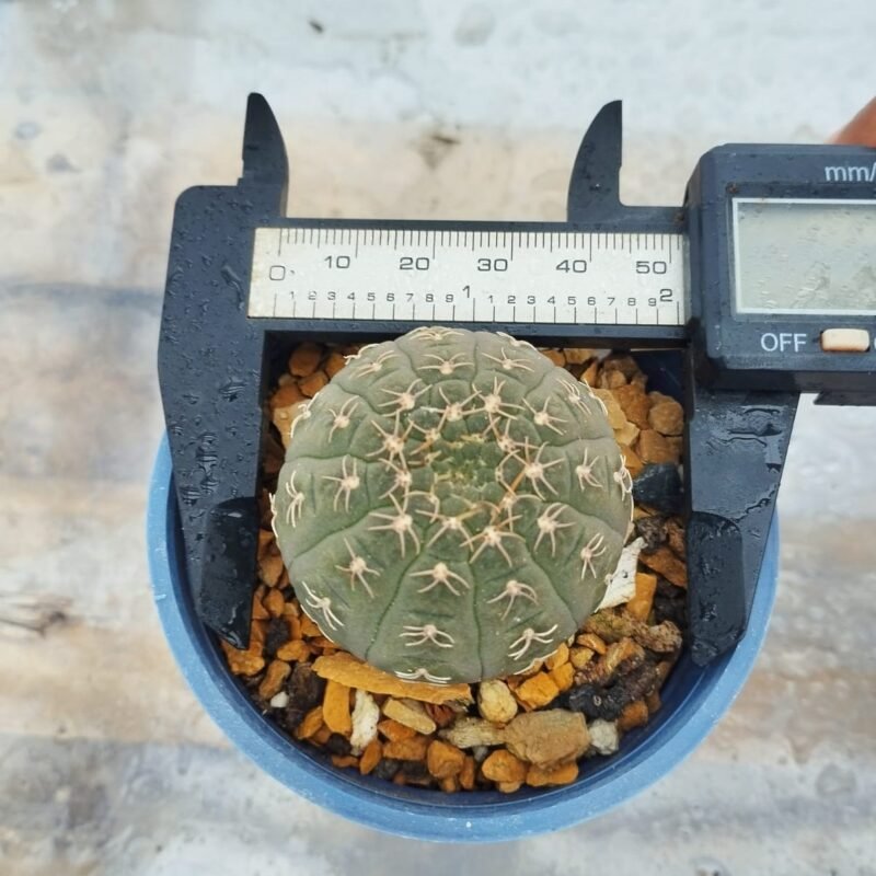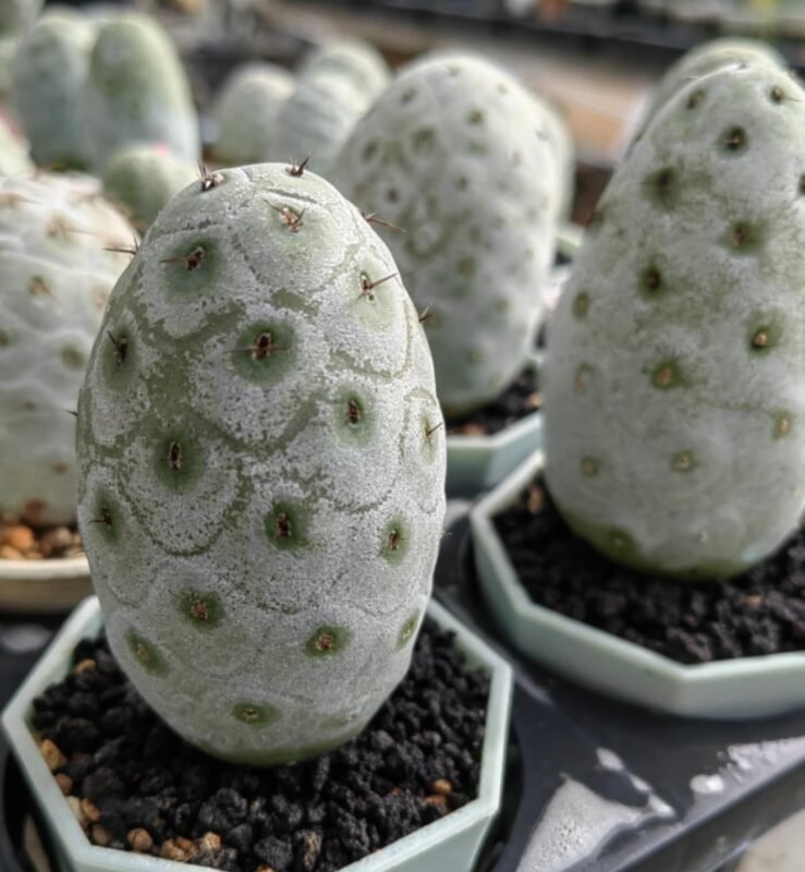 This cactus grows into a small round or slightly cylindrical stem, measuring about 3–5 cm tall. The body is light green to bluish-green with conical tubercles (areoles) covered in fine white to silver spines.