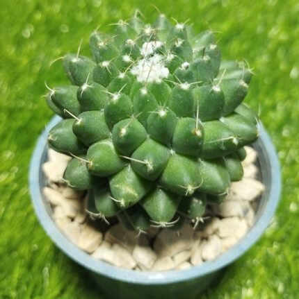 This cactus grows into a small round or slightly cylindrical stem, measuring about 3–5 cm tall. The body is light green to bluish-green with conical tubercles (areoles) covered in fine white to silver spines.