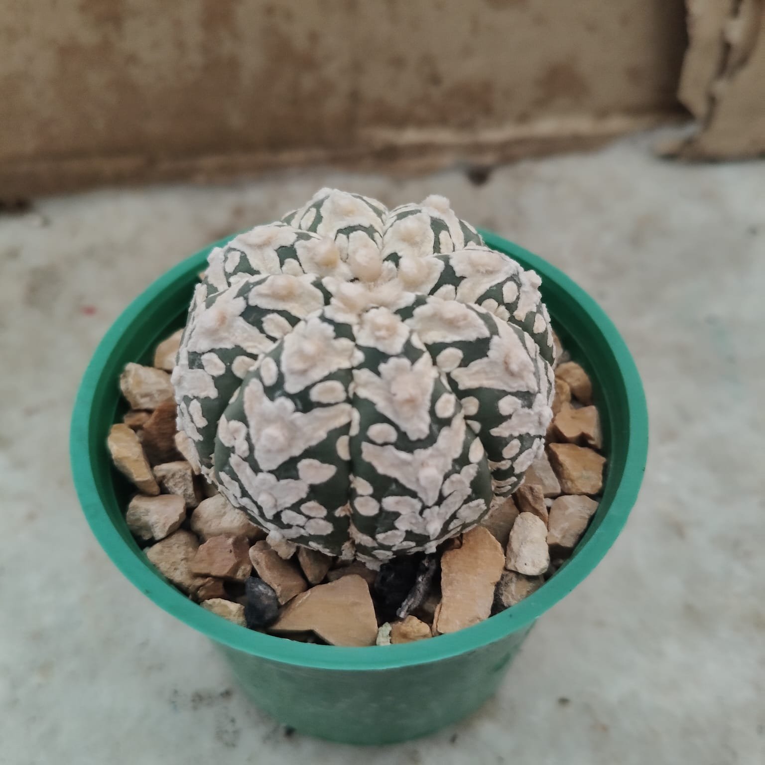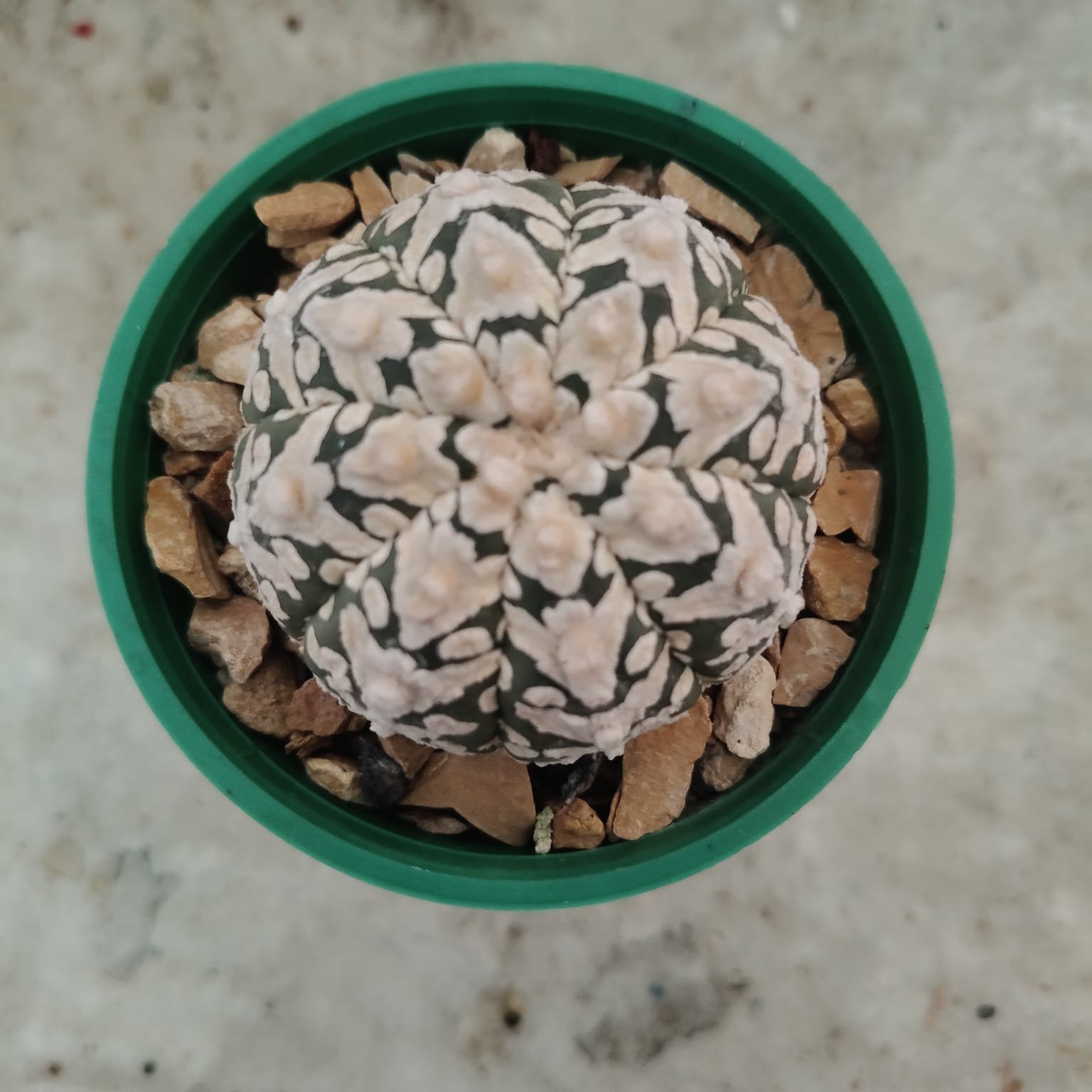Astrophytum asterias V Type is a highly desirable cactus variety characterized by its elegant V-shaped fleck patterns that appear along the ribs of the plant. The cactus has a flat, star-like shape with soft white flecks, giving it a unique and decorative look.
