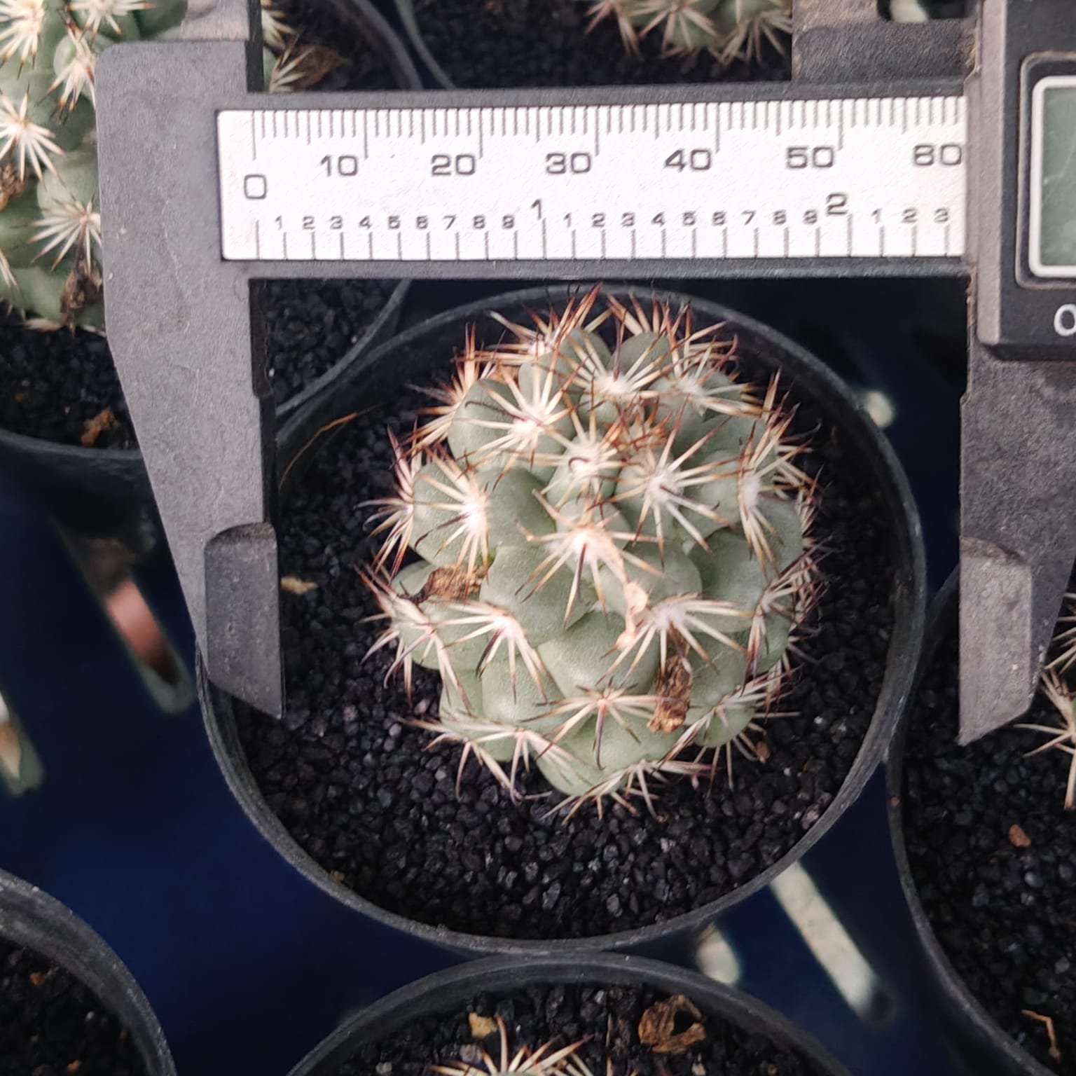 This cactus grows into a small round or slightly cylindrical stem, measuring about 3–5 cm tall. The body is light green to bluish-green with conical tubercles (areoles) covered in fine white to silver spines.